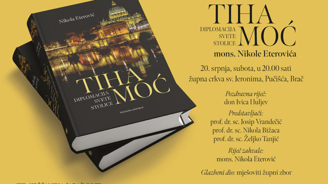 Nova knjiga papinskoga nuncija u Saveznoj Republici Njemačkoj nadbiskupa mons. Nikole Eterovića „Tiha moć. Diplomacija Svete Stolice“, objavljena u izdanju Kršćanske sadašnjosti, bit će predstavljena u subotu, 20. srpnja, u 20:00 sati u župnoj crkvi sv. Jeronima u Pučišćima. Knjigu će predstaviti: prof. dr. sc. Josip Vrandečić, prof. dr. sc. Nikola Bižaca i prof. dr. sc. Željko Tanjić, a zahvalnu riječ uputit će mons. Eterović.