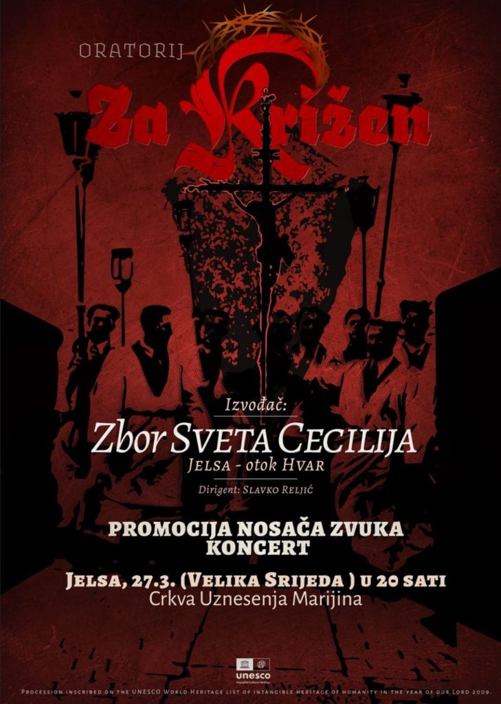 Promocija nosača zvuka na kojemu je snimljen oratorij „Za Križen“ u izvedbi zbora „Svete Cecilije“ iz Jelse na otoku Hvaru, pod dirigentskom palicom autora Slavka Reljića, bit će na Veliku srijedu 27. ožujka 2024. godine u 20 sati u crkvi Uznesenja Marijina u Jelsi.