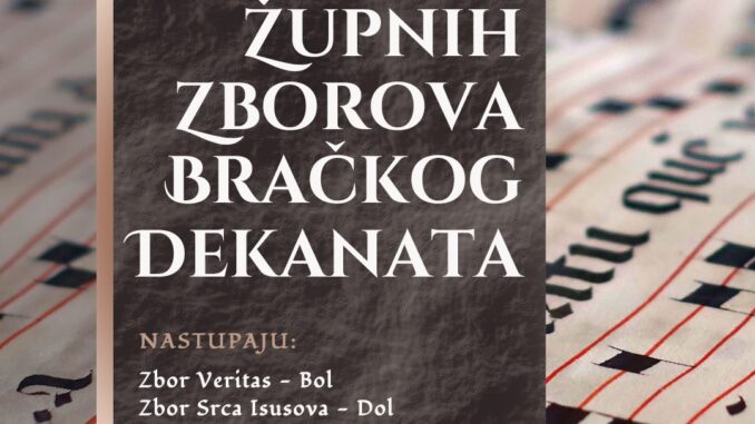 Smotra župnih zborova Bračkoga dekanata bit će održana u subotu, 15. veljače, u crkvi Bezgrešnog začeća BDM u Dračevici u organizaciji svećenika Bračkoga dekanata. Na smotri će nastupiti Zbor Veritas iz Župe sv. Ivana Krstitelja u Bolu, Zbor Srca Isusova iz Župe Očišćenja BDM u Dolu, Zbor sv. Nikole iz Župe sv. Nikole biskupa u Gornjem Humcu, Zbor sv. Margarite iz Župe Gospe Karmelske u Nerežišćima, Zbor Karmel iz Župe sv. Ivana Krstitelja u Postirima, Zbor sv. Jere iz Župe sv. Jeronima u Pučišćima, Zbor sv. Cecilije iz Župe sv. Petra u Supetru, udruženi zborovi Župa Sutivan i Mirca te gostujući Zbor sv. Jurja iz Župe sv. Jurja u Sućurju s Hvara. Smotra župnih zborova počinje u 17:30 sati.