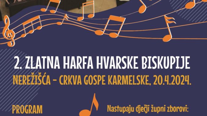 Zlatna harfa Hvarske biskupije održat će se u subotu, 20. travnja, u Župi Gospe Karmelske u Nerežišćima. Na Zlatnoj harfi nastupit će: Dječji katedralni zbor – Hvar, Slavuji – Jelsa, Anđeli maloga Isusa – Milna, Veselje – Pučišća, Rokovci – Stari Grad, Dječji zbor Krista Kralja – Selca, Raspjevani anđeli – Svirče i Dječji župni zbor – Supetar. Program smotre dječjih župnih zborova, koja će biti održana u crkvi Gospe Karmelske, počet će misnim slavljem koje će u 10:30 sati predvoditi generalni vikar Hvarske biskupije mons. Stanko Jerčić. Koncert dječjih zbora bit će održan s početkom u 11:30 sati.