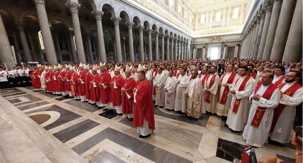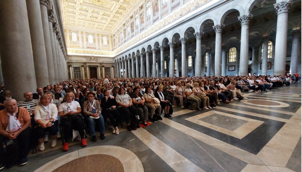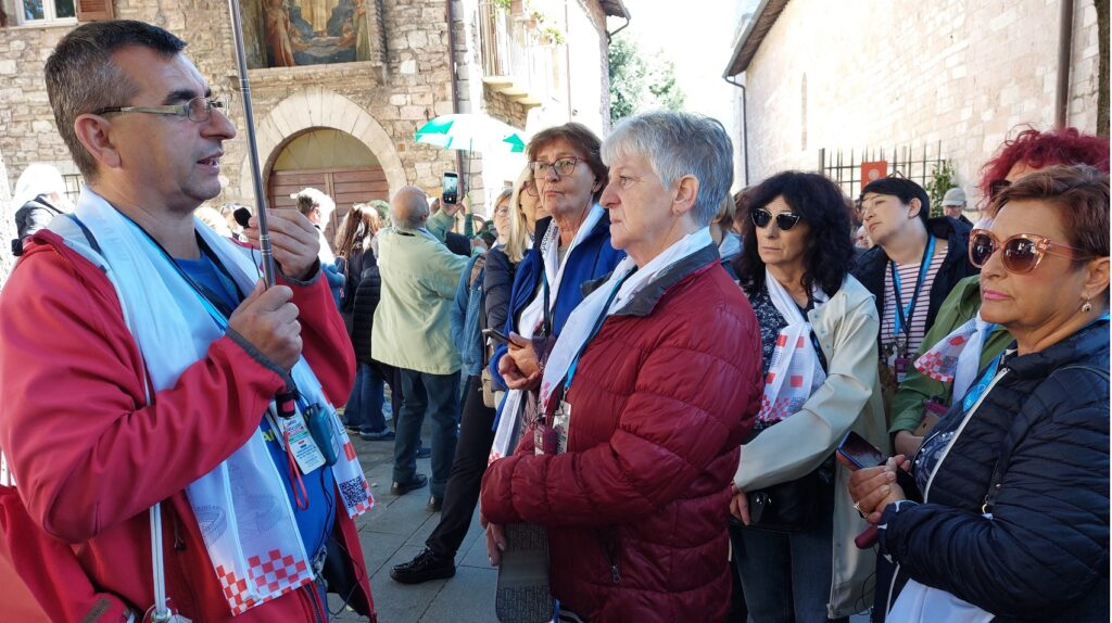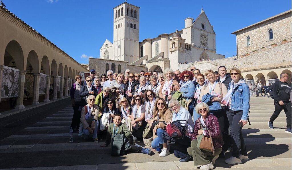 Stigavši u Anconu, krenuli smo prema Asizu gdje smo pohodili baziliku sv. Klare, crkvu Svete Marije Velike gdje se štuje bl. Carlo Acutis, Novu crkvu, koja čuva ostatke kuće sv. Franje Asiškoga, papinsku baziliku sv. Franje Asiškoga te crkvu Svete Marije Anđeoske u kojoj je Porciunkula. U njoj je svečano misno slavlje predvodio profesor na Katoličkom bogoslovnom fakultetu Sveučilišta u Splitu doc. dr. sc. fra Ivica Jurić, „u spomen na 800. obljetnicu Franjine Pjesme stvorova ili Pjesme brata Sunca, u kojoj je sv. Franjo dao viziju sveopćeg bratstva između ljudi i svih stvorenja.“ Suslavilo je desetak svećenika Splitsko-makarske nadbiskupije i Hvarske biskupije. Smjestili smo se u katoličkom gostinjcu Domus fraterna, udaljenom od Rima oko dva sata vožnje autobusima. U tamošnjoj crkvi bila su i dva klanjanja pred Presvetim što je vodio župnik iz Dugopolja don Mijo Grozdanić. Dok smo mi hodočasnici iz Splitsko-makarske nadbiskupije i Hvarske biskupije pohodili Asiz, drugi hodočasnici su pohodili Padovu, Spoleto, Pisu i druga mjesta.