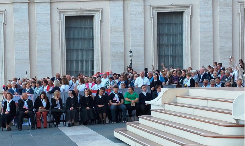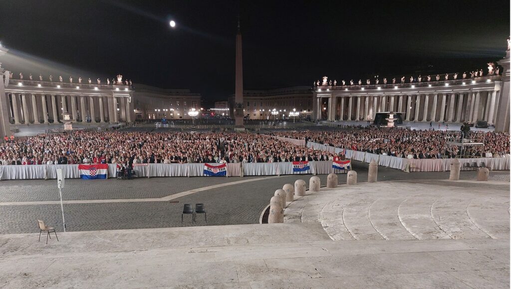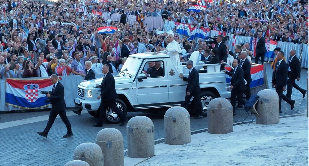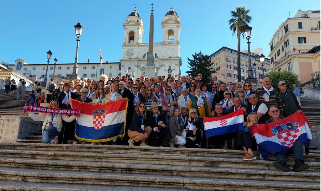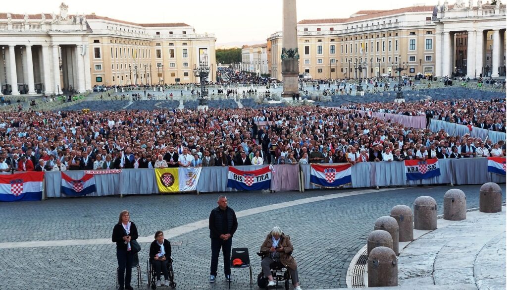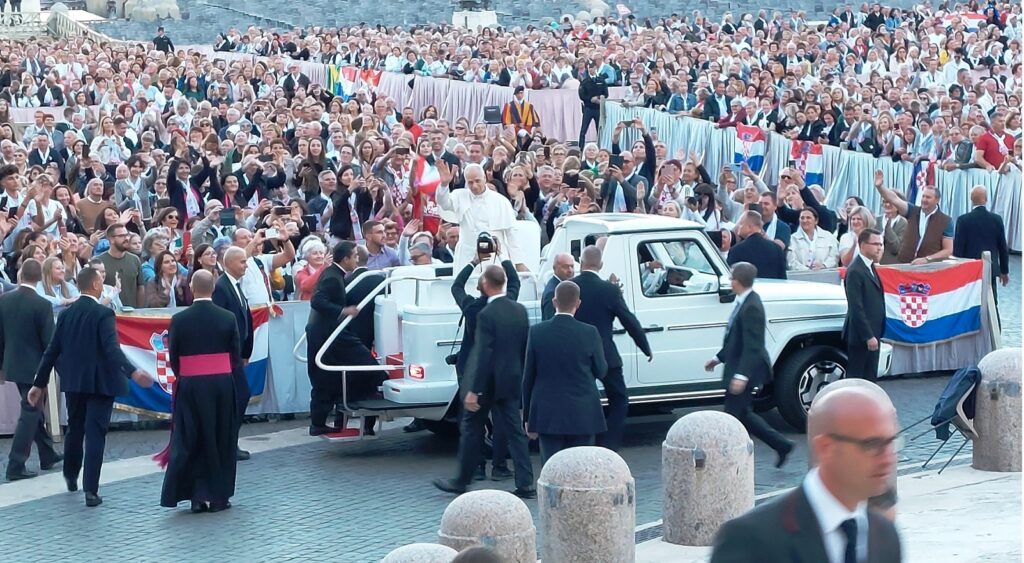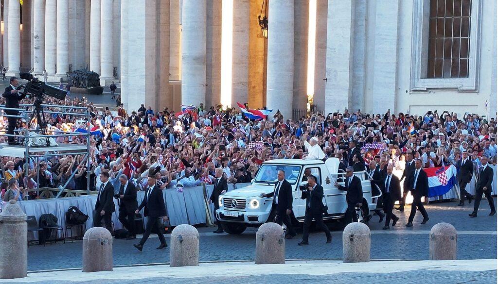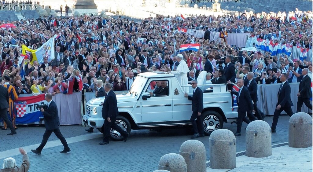 Približavamo se Trgu sv. Petra i već na oko 200 metara pred nama stoji široka i dugačka kolona hodočasnika. Trebalo je puno čekanja i strpljivosti da dođemo do policije koja sve pregleda. A onda opet duga kolona do Crkve sv. Petra. Prošli smo kroz Sveta vrata bazilike sv. Petra te, između ostaloga, pohodili grobove apostola Petra i sv. Ivana Pavla II. te vidjeli temelje nekadašnje Konstantinove bazilike. Područje gdje se nalaze grobovi papa naziva se Vatikanskim grotama. Tko je želio, mogao se popeti na kupolu Crkve sv. Petra i obići vatikanske muzeje. Nedugo što smo se vratili na Trg sv. Petra, u Crkvu sv. Petra više se nije moglo ulaziti. Štoviše, svi hodočasnici morali su napustiti Trg kako bi bio sigurnosno provjeren zbog dolaska Pape na susret s hrvatskim hodočasnicima. Nepregledno mnoštvo hodočasnika izašlo je s Trga te dugo i strpljivo čekalo ponovni ulazak na Trg. A Sunce prži. Unatoč tomu, orile su se hrvatske domoljubne i duhovne pjesme i vijorile hrvatske zastave. Napokon smo opet na isti način uspjeli ući na Trg. Oko desetak tisuća hrvatskih hodočasnika nade iz svih dijelova Hrvatske, Bosne i Hercegovine i inozemstva te oko 250 svećenika, brojni redovnici i redovnice te svi hrvatski biskupi i nadbiskupi, njih 24, među kojima je bio i hvarski biskup Ranko Vidović, nestrpljivo su očekivali pojavak pape Leona XIV. Konačno je oko 17, 30 sati došao u svom papamobilu, praćen jakim osiguranjem. Hodočasnici su ga gromoglasno pozdravljali, pjevali, mahali hrvatskim zastavama i svojim hodočasničkim šalovima s hrvatskom šahovnicom. Trgom se zaorila pjesma „Krist na žalu“, a čuli su se i povici: „Živio Papa, Papa mi te volimo!“ A Papa je, obilazeći oko hrvatskih hodočasnika, primao u ruke hrvatsku djecu, dres, zastave i šalove i sve blagoslivljao. Stigavši pred baziliku sv. Petra, burno je pozdravljen dugotrajnim pljeskom, koji je bio još jači kad su se nakon znaka križa i riječi „Pax vobis“ na latinskom, a onda i na hrvatskom jeziku čule njegove riječi: “Hvaljen Isus i Marija.“ Potom je Papa u svom govoru, između ostaloga, rekao kako je nazočnost tolikog broja hrvatskih hodočasnika znak koji govori o živosti vjere hrvatskog naroda, koji je tijekom stoljeća znao ostati čvrst u zajedništvu s Crkvom i vjeran nasljedniku apostola Petra. Hrvatskim hodočasnicima je poručio: „S radošću prenesite svojoj djeci i novim naraštajima kršćanske vrjednote!“ Nakon govora Papa je predmolio Očenaš te udijelio svoj apostolski blagoslov nazočnima na Trgu sv. Petra, njihovim obiteljima i svemu hrvatskom narodu. Potom su mu pojedinačno pristupili i pozdravili ga svi biskupi i nadbiskupi, predstavnici svećenika, redovnika i redovnica te pedesetak laika. Papa je sišao u podnožje Trga sv. Petra te pozdravio i blagoslovio dvije žene u invalidskim kolicima, a onda je, nakon 40-tak minuta boravka s hrvatskim hodočasnicima, uz svesrdni pljesak, napustio Trg sv. Petra.