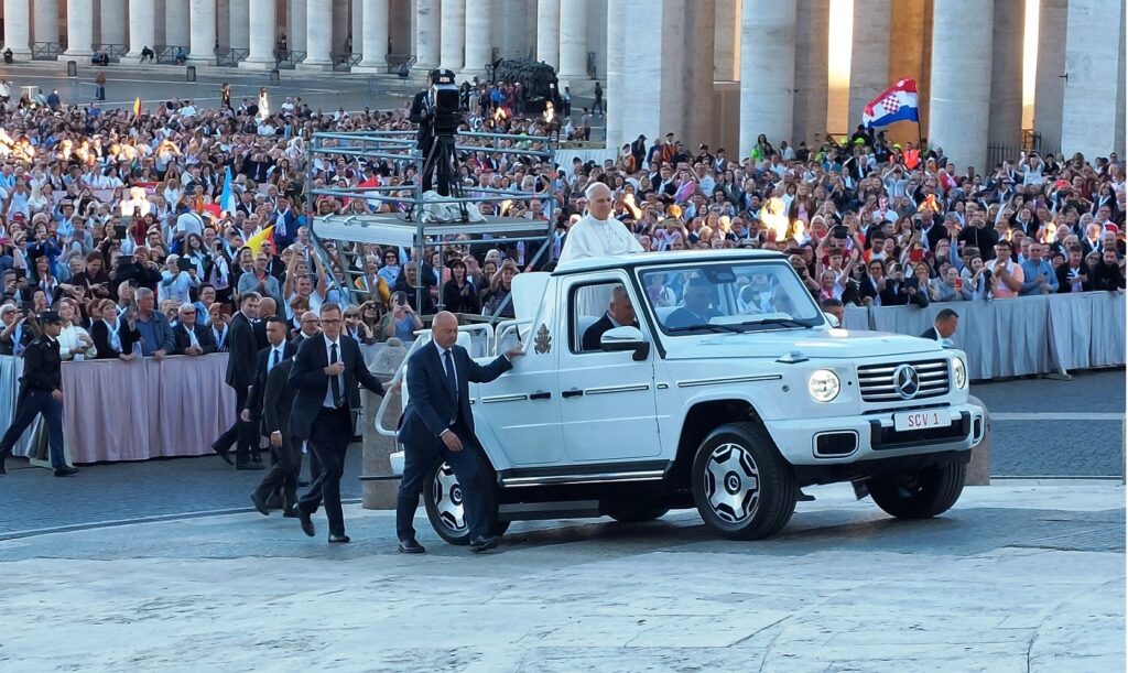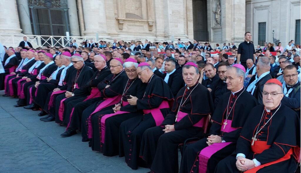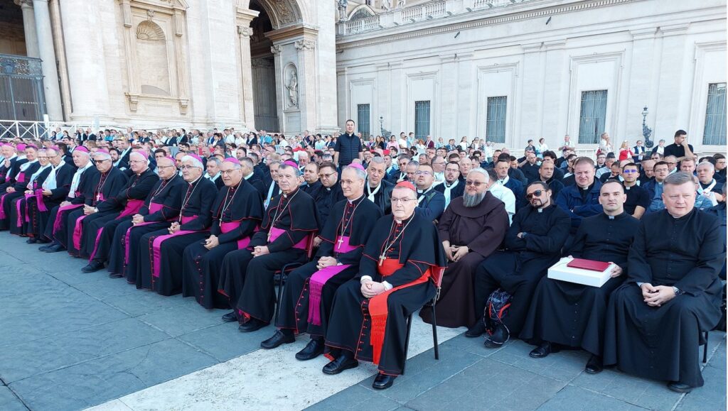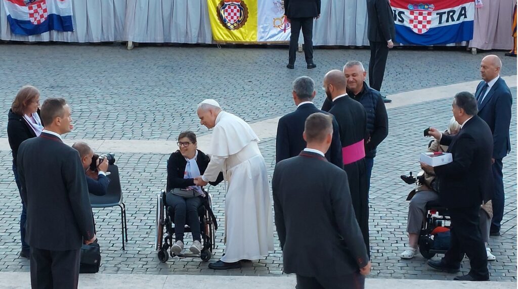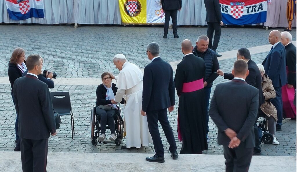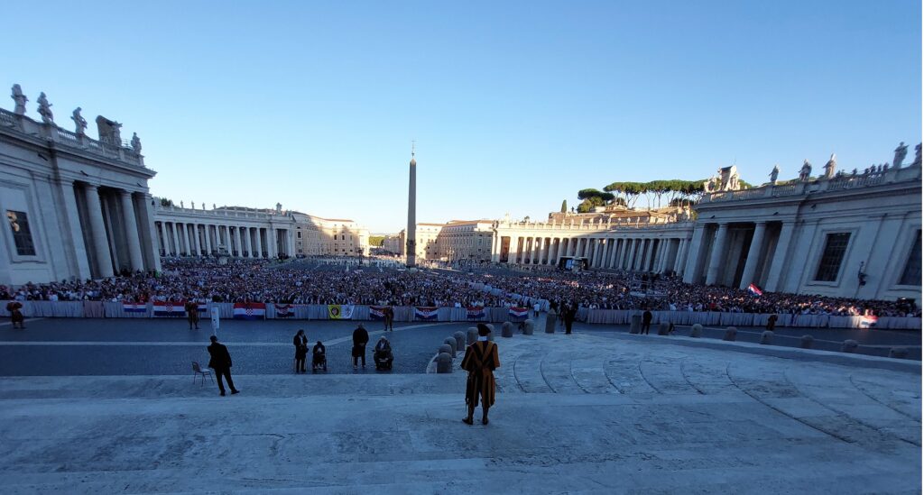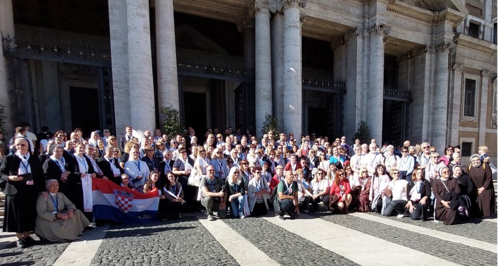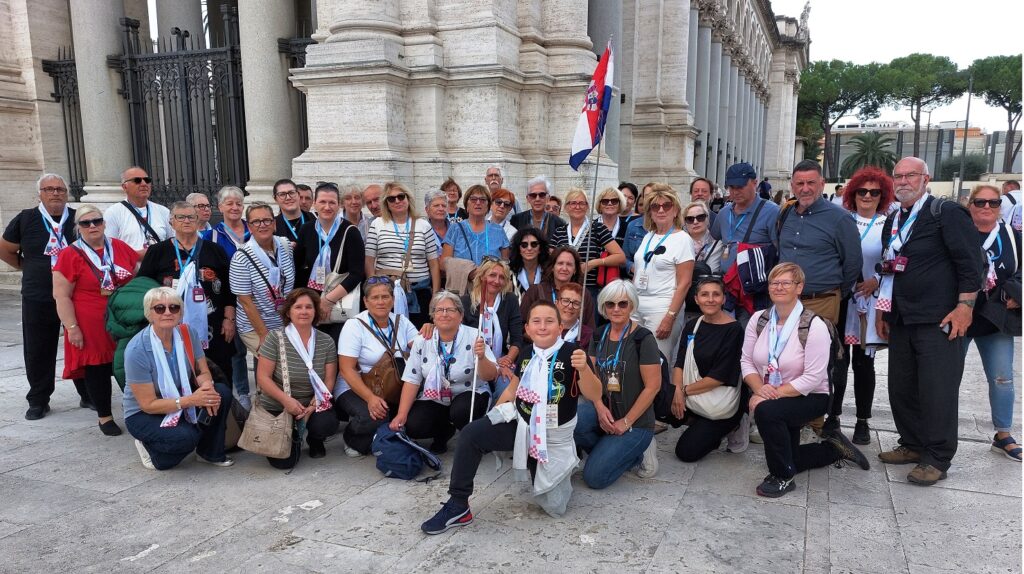 Približavamo se Trgu sv. Petra i već na oko 200 metara pred nama stoji široka i dugačka kolona hodočasnika. Trebalo je puno čekanja i strpljivosti da dođemo do policije koja sve pregleda. A onda opet duga kolona do Crkve sv. Petra. Prošli smo kroz Sveta vrata bazilike sv. Petra te, između ostaloga, pohodili grobove apostola Petra i sv. Ivana Pavla II. te vidjeli temelje nekadašnje Konstantinove bazilike. Područje gdje se nalaze grobovi papa naziva se Vatikanskim grotama. Tko je želio, mogao se popeti na kupolu Crkve sv. Petra i obići vatikanske muzeje. Nedugo što smo se vratili na Trg sv. Petra, u Crkvu sv. Petra više se nije moglo ulaziti. Štoviše, svi hodočasnici morali su napustiti Trg kako bi bio sigurnosno provjeren zbog dolaska Pape na susret s hrvatskim hodočasnicima. Nepregledno mnoštvo hodočasnika izašlo je s Trga te dugo i strpljivo čekalo ponovni ulazak na Trg. A Sunce prži. Unatoč tomu, orile su se hrvatske domoljubne i duhovne pjesme i vijorile hrvatske zastave. Napokon smo opet na isti način uspjeli ući na Trg. Oko desetak tisuća hrvatskih hodočasnika nade iz svih dijelova Hrvatske, Bosne i Hercegovine i inozemstva te oko 250 svećenika, brojni redovnici i redovnice te svi hrvatski biskupi i nadbiskupi, njih 24, među kojima je bio i hvarski biskup Ranko Vidović, nestrpljivo su očekivali pojavak pape Leona XIV. Konačno je oko 17, 30 sati došao u svom papamobilu, praćen jakim osiguranjem. Hodočasnici su ga gromoglasno pozdravljali, pjevali, mahali hrvatskim zastavama i svojim hodočasničkim šalovima s hrvatskom šahovnicom. Trgom se zaorila pjesma „Krist na žalu“, a čuli su se i povici: „Živio Papa, Papa mi te volimo!“ A Papa je, obilazeći oko hrvatskih hodočasnika, primao u ruke hrvatsku djecu, dres, zastave i šalove i sve blagoslivljao. Stigavši pred baziliku sv. Petra, burno je pozdravljen dugotrajnim pljeskom, koji je bio još jači kad su se nakon znaka križa i riječi „Pax vobis“ na latinskom, a onda i na hrvatskom jeziku čule njegove riječi: “Hvaljen Isus i Marija.“ Potom je Papa u svom govoru, između ostaloga, rekao kako je nazočnost tolikog broja hrvatskih hodočasnika znak koji govori o živosti vjere hrvatskog naroda, koji je tijekom stoljeća znao ostati čvrst u zajedništvu s Crkvom i vjeran nasljedniku apostola Petra. Hrvatskim hodočasnicima je poručio: „S radošću prenesite svojoj djeci i novim naraštajima kršćanske vrjednote!“ Nakon govora Papa je predmolio Očenaš te udijelio svoj apostolski blagoslov nazočnima na Trgu sv. Petra, njihovim obiteljima i svemu hrvatskom narodu. Potom su mu pojedinačno pristupili i pozdravili ga svi biskupi i nadbiskupi, predstavnici svećenika, redovnika i redovnica te pedesetak laika. Papa je sišao u podnožje Trga sv. Petra te pozdravio i blagoslovio dvije žene u invalidskim kolicima, a onda je, nakon 40-tak minuta boravka s hrvatskim hodočasnicima, uz svesrdni pljesak, napustio Trg sv. Petra.