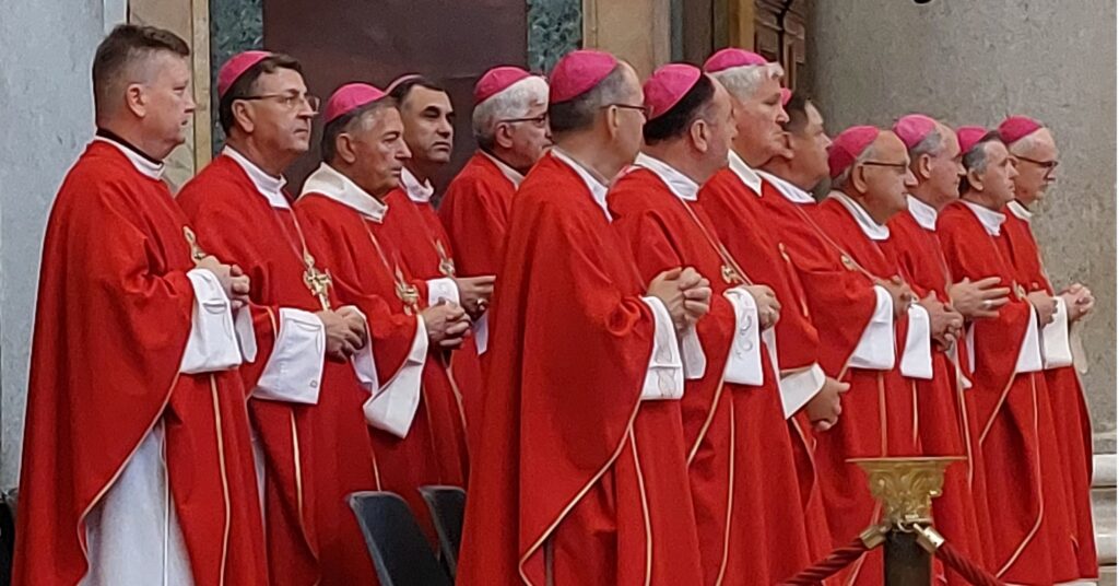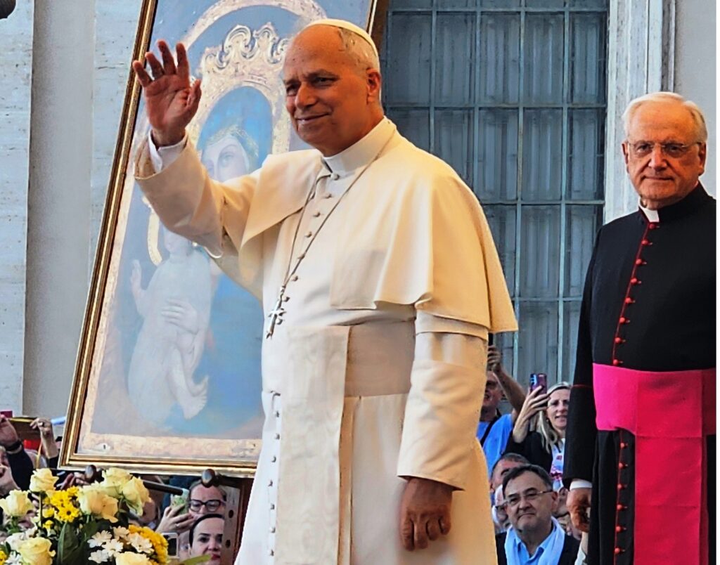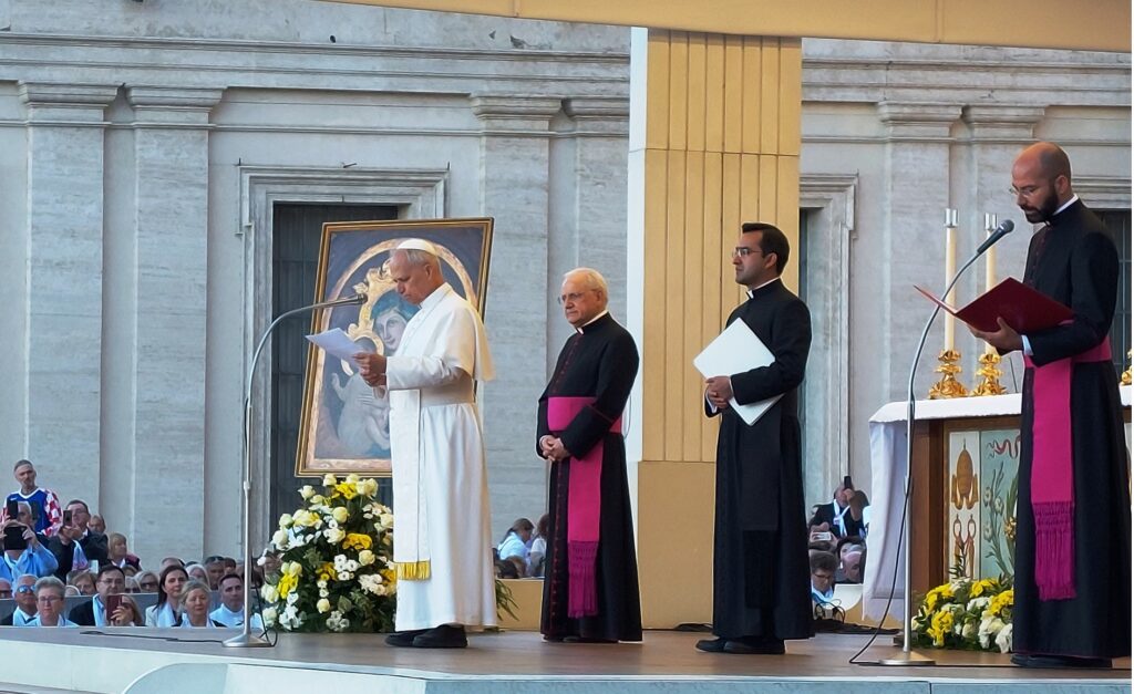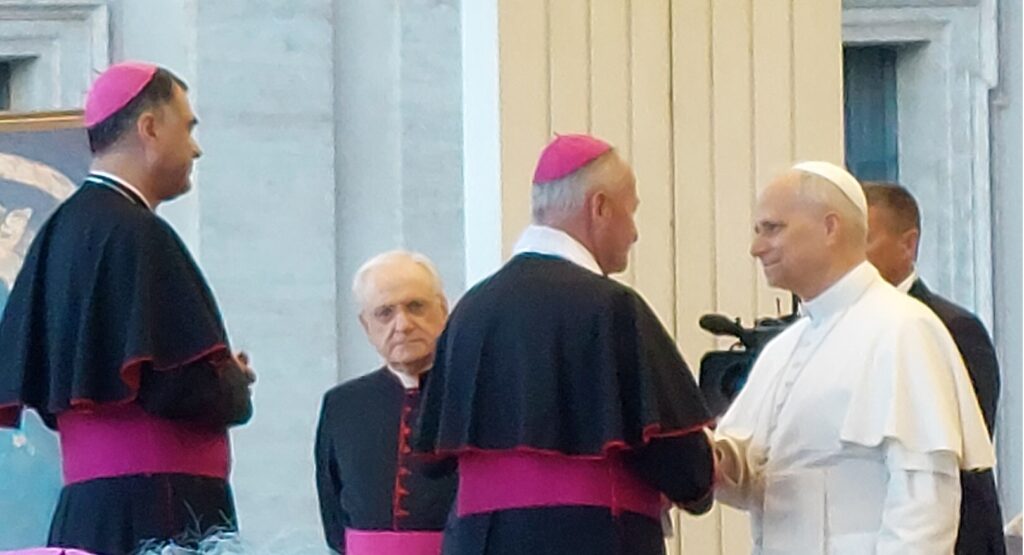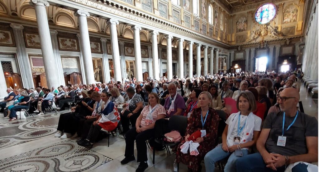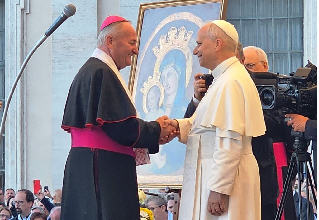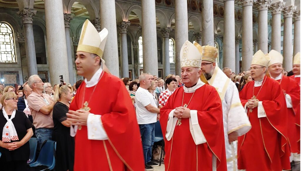 Približavamo se Trgu sv. Petra i već na oko 200 metara pred nama stoji široka i dugačka kolona hodočasnika. Trebalo je puno čekanja i strpljivosti da dođemo do policije koja sve pregleda. A onda opet duga kolona do Crkve sv. Petra. Prošli smo kroz Sveta vrata bazilike sv. Petra te, između ostaloga, pohodili grobove apostola Petra i sv. Ivana Pavla II. te vidjeli temelje nekadašnje Konstantinove bazilike. Područje gdje se nalaze grobovi papa naziva se Vatikanskim grotama. Tko je želio, mogao se popeti na kupolu Crkve sv. Petra i obići vatikanske muzeje. Nedugo što smo se vratili na Trg sv. Petra, u Crkvu sv. Petra više se nije moglo ulaziti. Štoviše, svi hodočasnici morali su napustiti Trg kako bi bio sigurnosno provjeren zbog dolaska Pape na susret s hrvatskim hodočasnicima. Nepregledno mnoštvo hodočasnika izašlo je s Trga te dugo i strpljivo čekalo ponovni ulazak na Trg. A Sunce prži. Unatoč tomu, orile su se hrvatske domoljubne i duhovne pjesme i vijorile hrvatske zastave. Napokon smo opet na isti način uspjeli ući na Trg. Oko desetak tisuća hrvatskih hodočasnika nade iz svih dijelova Hrvatske, Bosne i Hercegovine i inozemstva te oko 250 svećenika, brojni redovnici i redovnice te svi hrvatski biskupi i nadbiskupi, njih 24, među kojima je bio i hvarski biskup Ranko Vidović, nestrpljivo su očekivali pojavak pape Leona XIV. Konačno je oko 17, 30 sati došao u svom papamobilu, praćen jakim osiguranjem. Hodočasnici su ga gromoglasno pozdravljali, pjevali, mahali hrvatskim zastavama i svojim hodočasničkim šalovima s hrvatskom šahovnicom. Trgom se zaorila pjesma „Krist na žalu“, a čuli su se i povici: „Živio Papa, Papa mi te volimo!“ A Papa je, obilazeći oko hrvatskih hodočasnika, primao u ruke hrvatsku djecu, dres, zastave i šalove i sve blagoslivljao. Stigavši pred baziliku sv. Petra, burno je pozdravljen dugotrajnim pljeskom, koji je bio još jači kad su se nakon znaka križa i riječi „Pax vobis“ na latinskom, a onda i na hrvatskom jeziku čule njegove riječi: “Hvaljen Isus i Marija.“ Potom je Papa u svom govoru, između ostaloga, rekao kako je nazočnost tolikog broja hrvatskih hodočasnika znak koji govori o živosti vjere hrvatskog naroda, koji je tijekom stoljeća znao ostati čvrst u zajedništvu s Crkvom i vjeran nasljedniku apostola Petra. Hrvatskim hodočasnicima je poručio: „S radošću prenesite svojoj djeci i novim naraštajima kršćanske vrjednote!“ Nakon govora Papa je predmolio Očenaš te udijelio svoj apostolski blagoslov nazočnima na Trgu sv. Petra, njihovim obiteljima i svemu hrvatskom narodu. Potom su mu pojedinačno pristupili i pozdravili ga svi biskupi i nadbiskupi, predstavnici svećenika, redovnika i redovnica te pedesetak laika. Papa je sišao u podnožje Trga sv. Petra te pozdravio i blagoslovio dvije žene u invalidskim kolicima, a onda je, nakon 40-tak minuta boravka s hrvatskim hodočasnicima, uz svesrdni pljesak, napustio Trg sv. Petra.