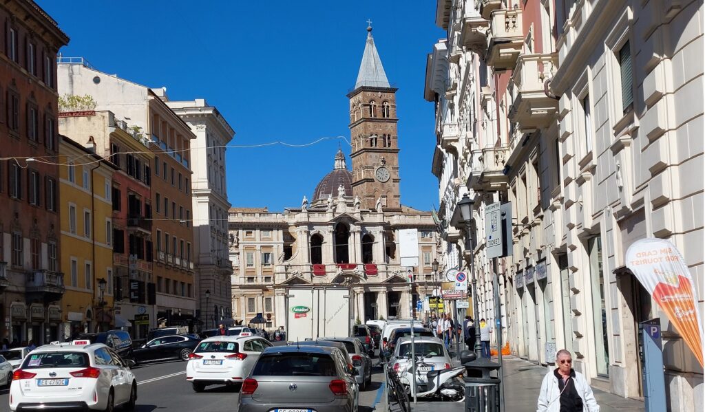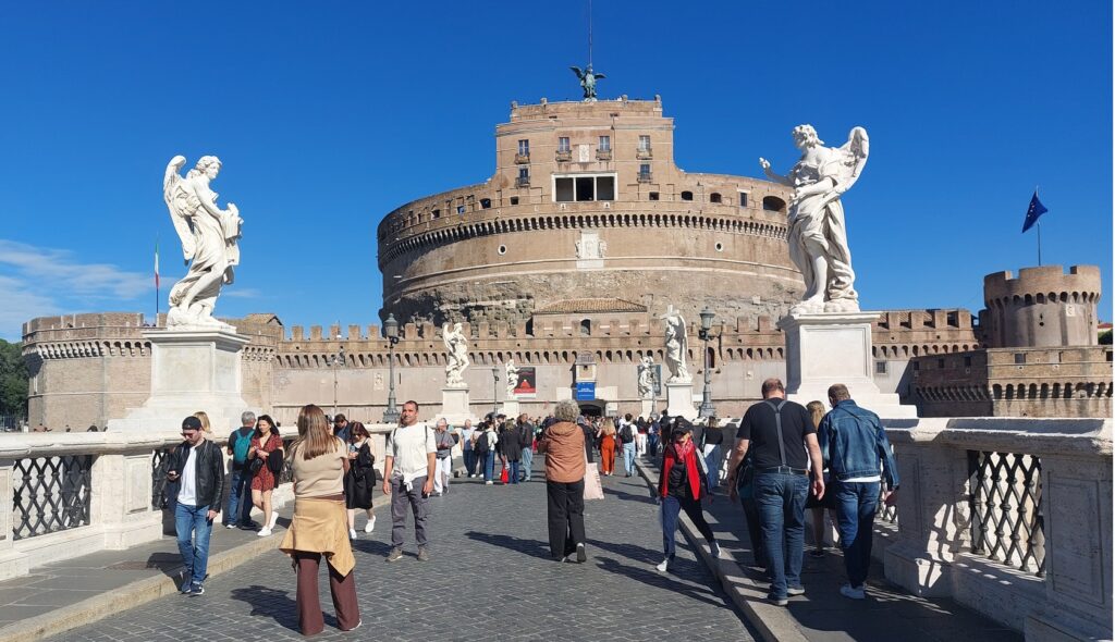 Idući dalje ka crkvi sv. Petra, prolazimo pokraj još jedne prelijepe crkve, a onda prelazimo monumentalni most preko rijeke Tiber na kojemu su dva velika anđela. Dalje prolazimo pokraj velebne kružne utvrde zvane Castel Sant’ Angelo, s brončanim kipom sv. Mihaela na vrhu utvrde, koja je originalno mauzolej rimskog cara Hadrijana.