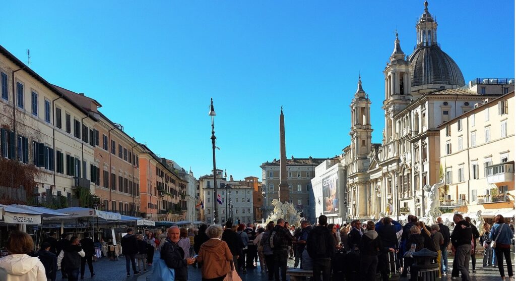 Trećeg dana, u utorak, prošli smo pokraj francuske crkve Presvetog Trojstva na Brdu, ispred koje je impozantni obelisk te se niz Španjolske scale spustili do Šanjolskog trga s velikim Gospinim kipom na stupu ispod kojega piše: „Zdravo, milosti puna, Gospodin s Tobom, blagoslovljena Ti među ženama.“ Tu „Papa svake godine dolazi moliti i častiti Gospu Bezgrešnu, na uspomenu na njezino Bezgrešno začeće.“ Potom smo pohodili Hrvatsku crkvu sv. Jeronima i došli na veličanstveni trg Navona gdje su između brojnih znamenitih umjetničkih djela i tri zadivljujuće fontane. Trg je galerija lijepih skulptura i još ljepših arhitektonskih kreacija. Izgleda poput unutrašnjosti nekog velikog kazališta. Stoga taj trg predstavlja jednu od najljepših cjelina baroknog umjetničkog i arhitektonskog stila u Rimu i na svijetu. Trg je današnji oblik dobio ponajviše zaslugom pape Inocenta X., iz moćne kardinalske obitelji Pamphilj, čija je impozantna palača pokraj trga, a uz nju je crkva sv. Agneze s dva tornja. U antičkom Rimu na ovom trgu bio je stadion cara Domicijana, dugačak čak 276 metara, a širok 54 metra. Mogao je primiti 30.000 gledatelja. Pretpostavlja se da je trg Navona dobio ime po latinskoj riječi agones – igre.